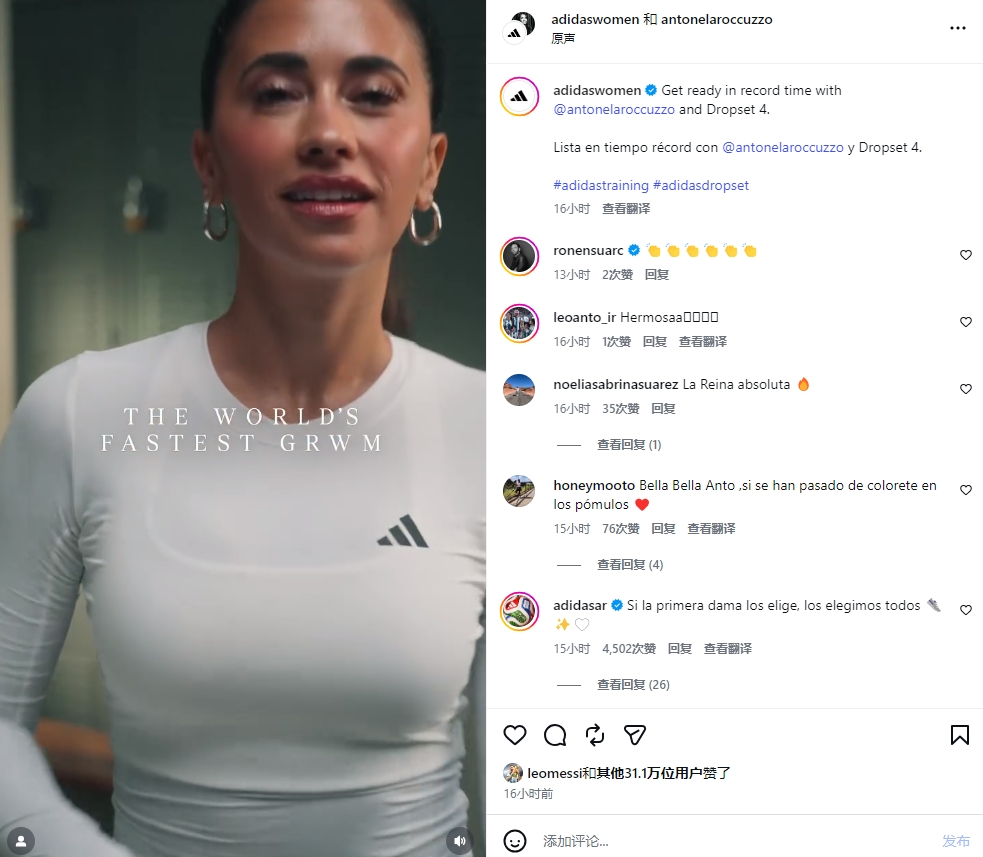 安东内拉与阿迪达斯合作的Dropset 4运动鞋——"跟我一起准备"(Get Ready With Me)视频火遍全网,这款运动鞋专为训练和竞赛设计,兼具运动时尚爱好者钟爱的极简与时尚风格,梅西帮忙为视频点赞。